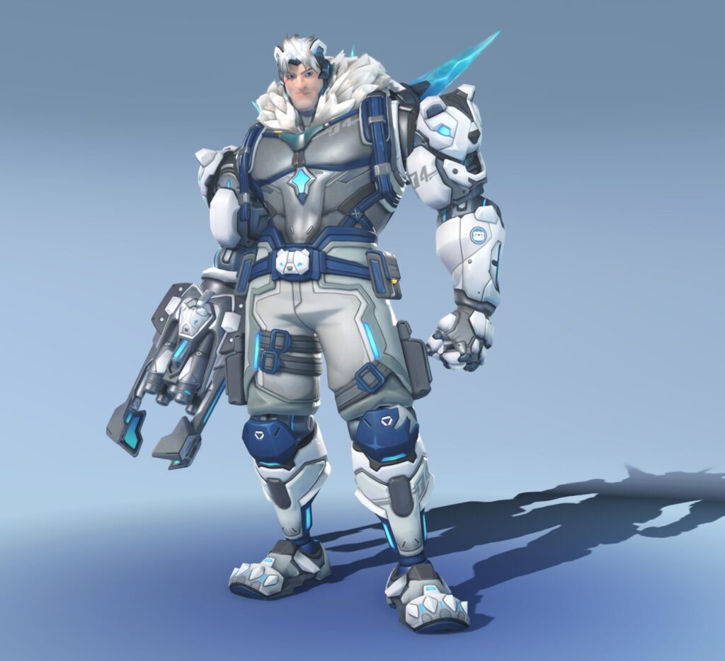 - O corpo ganha armadura pesada, com detalhes de gelo e metal, como se ele fosse um experimento de combate em clima ártico.