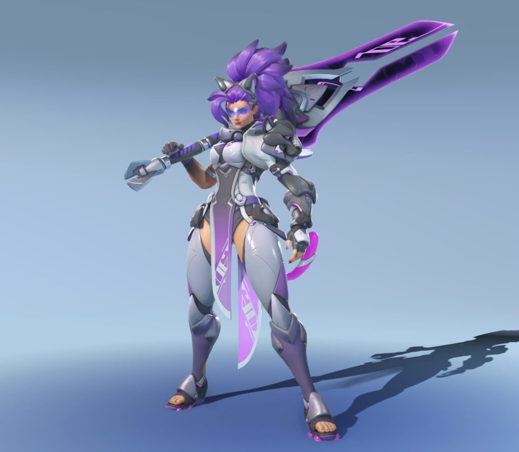 - A paleta de cor puxando para o roxo e o visual da espada entregam bem a ideia “predadora noturna futurista”.