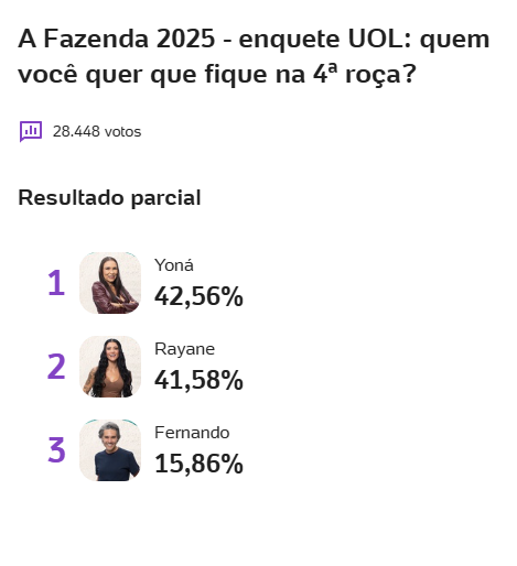 As parciais mostram Yoná Sousa liderando folgada na Votalhada e mantendo vantagem na UOL, enquanto Rayane disputa voto a voto com Fernando, que aparece em situação mais delicada. Mas, como toda roça de A Fazenda, tudo pode mudar a qualquer momento e cada voto faz diferença no destino dos peões!