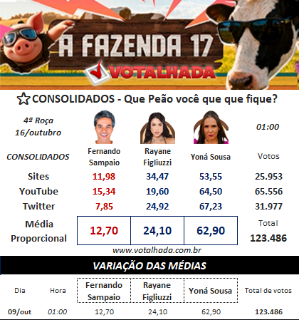 Enquete A Fazenda 17 Votalhada (Atualizado em 16/10 às 01:00)