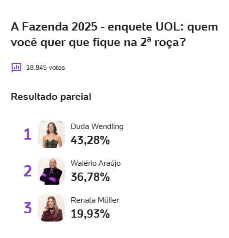 A segunda roça de A Fazenda 17 segue mobilizando torcidas e causando reviravoltas na preferência do público! Duda Wendling, Walério Araújo e Renata Muller estão na berlinda, e a votação já ganhou contornos emocionantes, com variação nos percentuais entre as principais enquetes UOL e Votalhada.