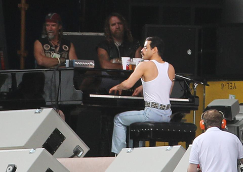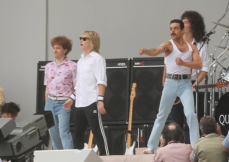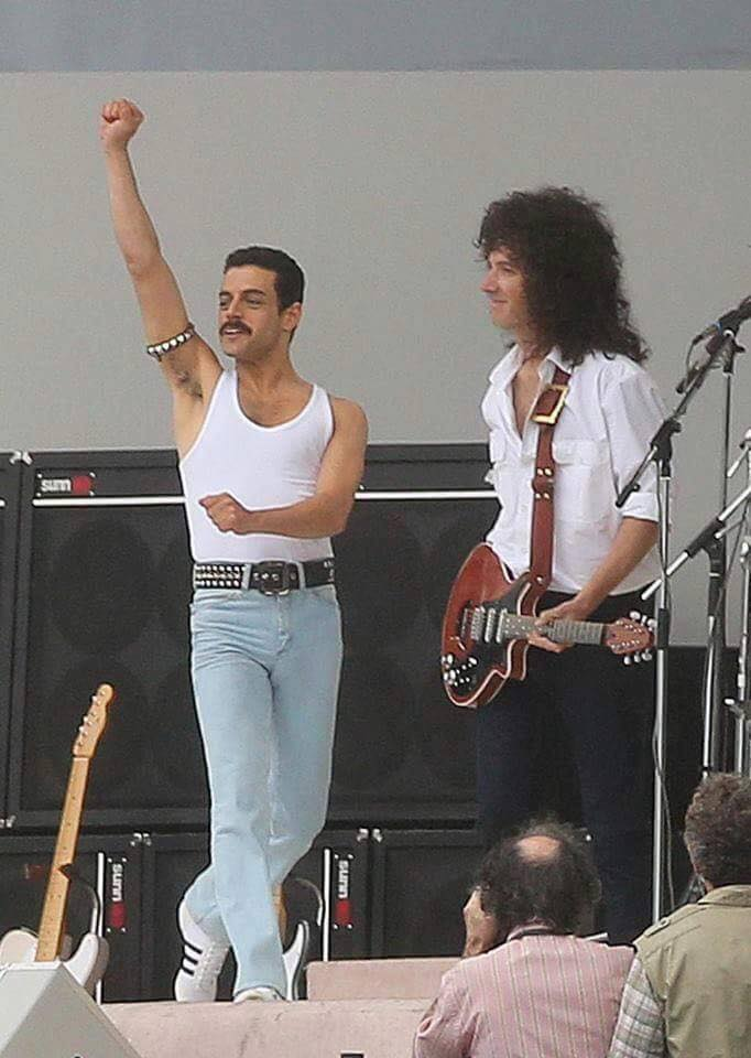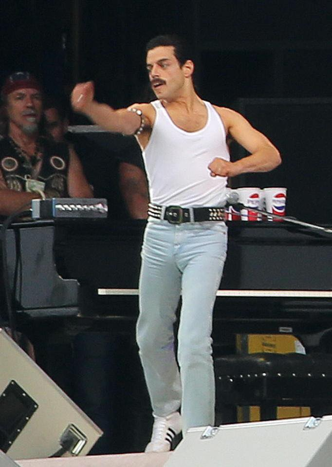 Foram relevadas novas fotos de Rami Malek interpretando Freddie Mercury. Na cena, o ator está reencenando o show de 1985 do Queen durante o Live Aid. Confira: