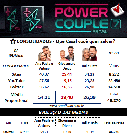 A votação está acirrada principalmente entre Ana Paula & Antony contra os demais casais nas duas enquetes! No UOL, a disputa está quase empatada entre todos, apostando em reviravoltas até a formação do resultado oficial! Já na Votalhada, Ana Paula e Antony despontam com larga vantagem, seguidos por Talira & Rafa.