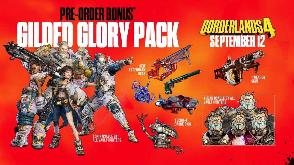 Na pré-venda, quem adquirir Borderlands 4 para qualquer plataforma ou via Steam/Epic recebe o Pacote Glória Dourada, que foi reforçado com quatro peças de equipamento lendário e o cosmético “Cabeça de Caçador de Arcas”.