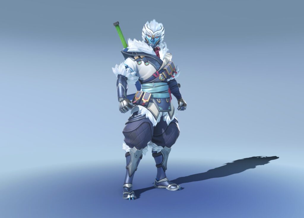 Um Genji inspirado em um espírito/“macaco” da neve, misturando armadura e elementos de criatura mística de inverno. É uma das skins mais chamativas do passe.