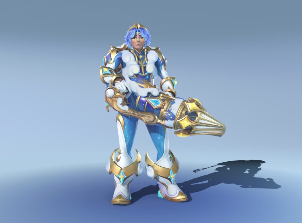 - Paleta com muito dourado, brilho celeste e efeitos que destacam a silhueta dele em qualquer mapa