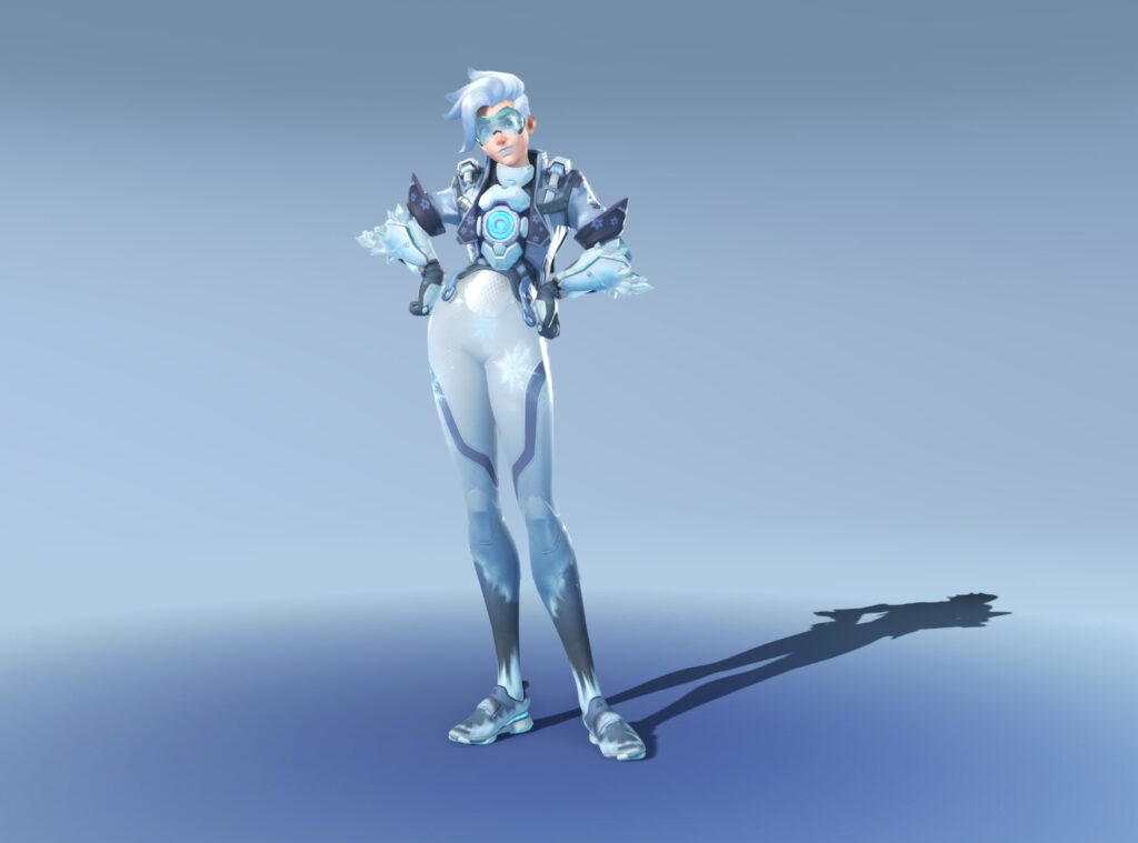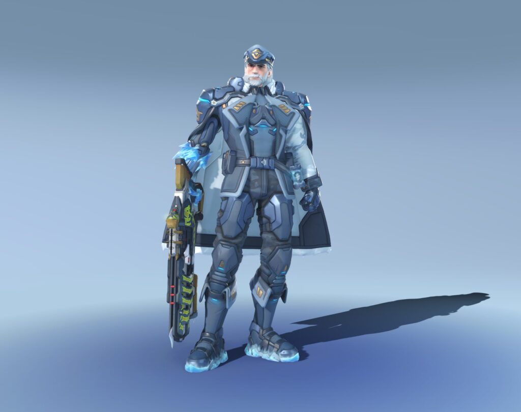 Soldier 76 com visual de combate no frio: roupa pesada, detalhes de gelo e paleta puxada para tons frios. Aquela skin que não reinventa o personagem, mas encaixa bem no tema.
