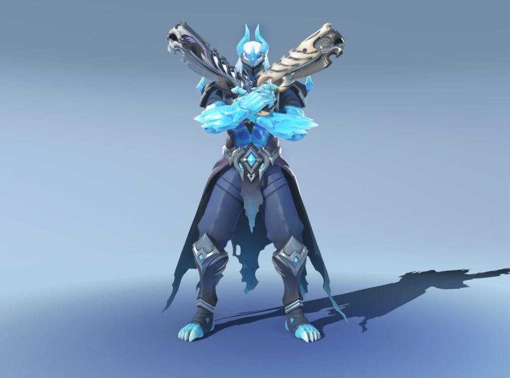 Reaper vira uma espécie de necromante/lorde gélido. Capuz, ossos, gelo e aquele ar de “chefe de raid”. É o tipo de visual que combina demais com a silhueta dele.