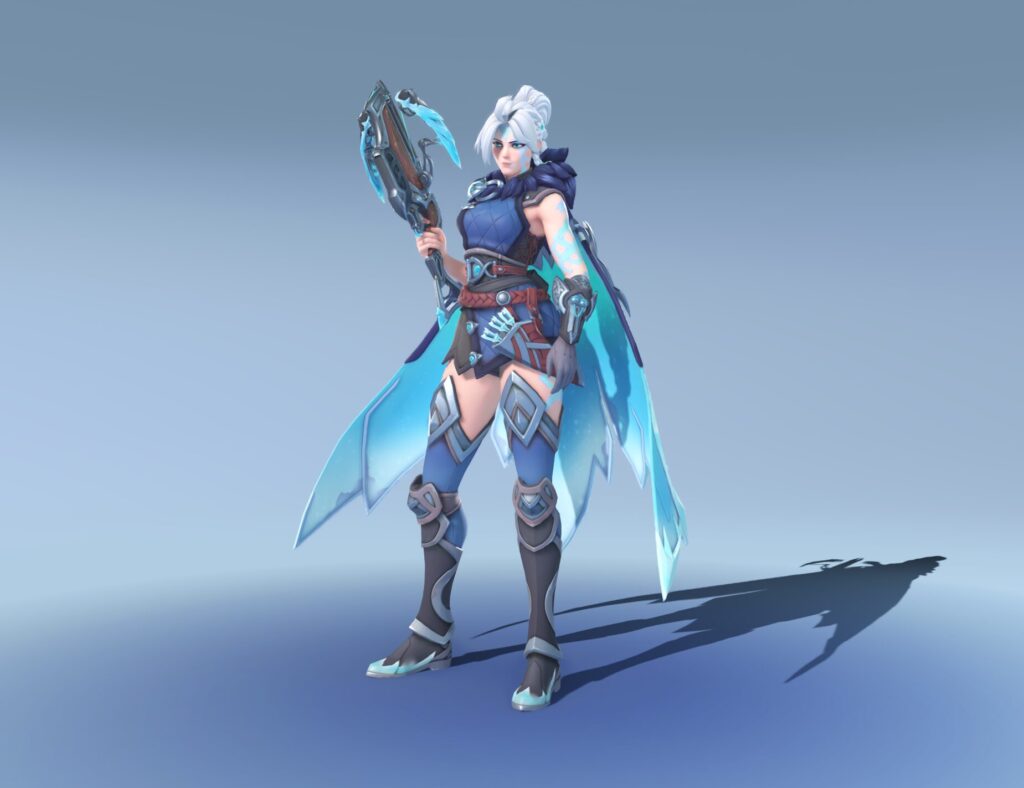 Freja encarna Skadi, figura da mitologia nórdica associada a montanhas e inverno. É uma skin que eleva bem o personagem ao nível “deusa mitológica”, consolidando a proposta do passe.