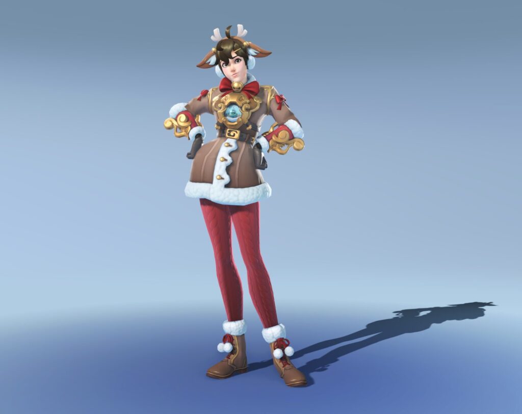 Essas duas são bem voltadas para a fantasia de fim de ano: a Tracer de rena é quase a definição de “skin natalina”, enquanto a Vendetta ganha um visual social/elegante que contrasta com sua persona brutal.