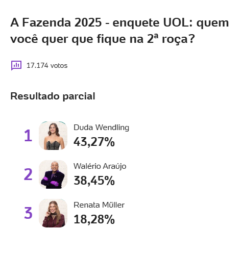 Assim que as votações abrem, a movimentação das torcidas chama atenção! Duda Wendling lidera com folga nas duas enquetes, tornando-se forte favorita para continuar na disputa. Walério Araújo aparece na vice-liderança pela UOL, enquanto Renata Muller aparece na segunda posição na Votalhada, mas ambos ainda correm risco com a alta volatilidade da votação. O público de A Fazenda sabe: cada voto pode virar o próximo grande acontecimento do reality!