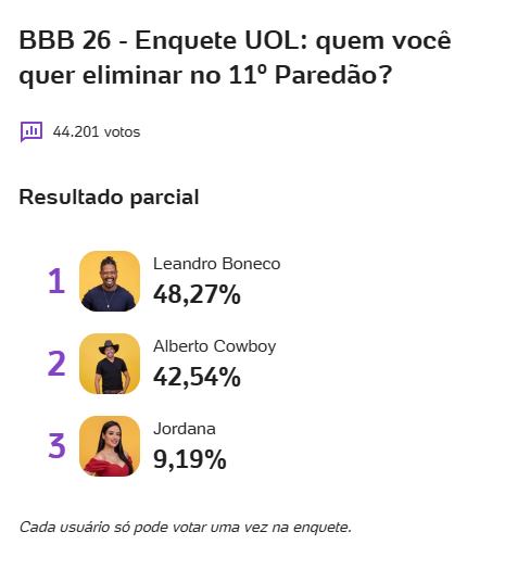 A atualização do final da manhã na enquete do UOL mostra que a votação continua muito concentrada em Leandro e Alberto, com Jordana mais afastada da disputa principal.