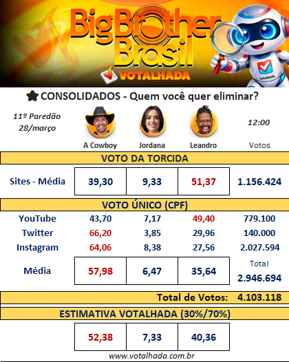 Pesquisa Votalhada BBB 26 11º Paredão (Atualizado às 12h de 28/03):