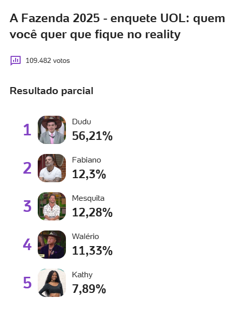 A atualização das 17h53 da Enquete UOL traz um dado impressionante: Fabiano Moraes e Luiz Otávio Mesquita estão separados por apenas 0,02%. Fabiano aparece com 12,30% e Mesquita com 12,28%, configurando um empate técnico absoluto na luta pela segunda posição. Walério Araújo vem logo atrás, também muito próximo, enquanto Kathy Maravilha segue na zona de risco, mas ainda com chances matemáticas de virada.