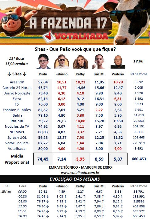 Parcial Enquete UOL Roça Especial A Fazenda 17 (Atualizado 15/12 às 17:53)