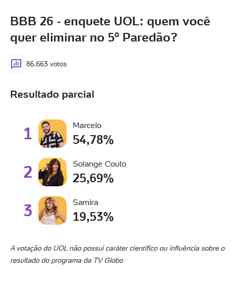 Enquete atualizada BBB 26 UOL e Votalhada apontam quem sai entre Marcelo, Samira e Solange no 5º paredão