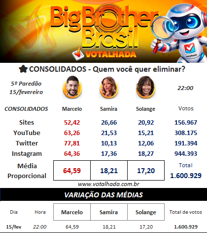 Pesquisa Votalhada BBB 26 (Atualizada às 22h de 15/02):