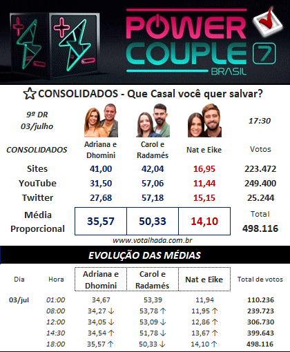 A votação deixa claro que Carol e Radamés seguem na liderança nas principais enquetes, mas Adriana e Dhomini continuam muito próximos, principalmente na UOL, onde a diferença quase não existe. Nat e Eike continuam em terceiro e precisam de uma virada histórica para escapar da eliminação.