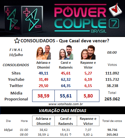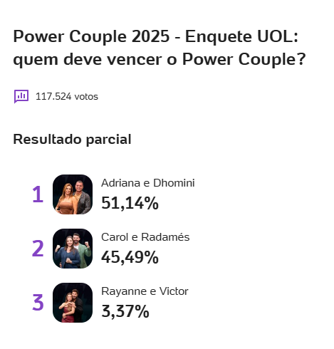 Parcial Enquete UOL e Votalhada Final do Power Couple Brasil segue movimentando as torcidas nas redes sociais e promete uma das decisões mais disputadas da história do reality! Com a grande final marcada para esta quinta-feira, 10, a expectativa só aumenta para saber se Adriana e Dhomini ou Carol e Radamés vão levantar o troféu — enquanto Rayanne e Victor lutam para surpreender na reta final.