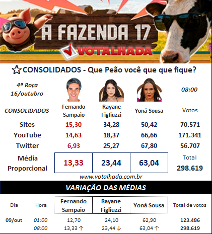 Enquete A Fazenda 17 Votalhada (Atualizado em 16/10 às 08:00)