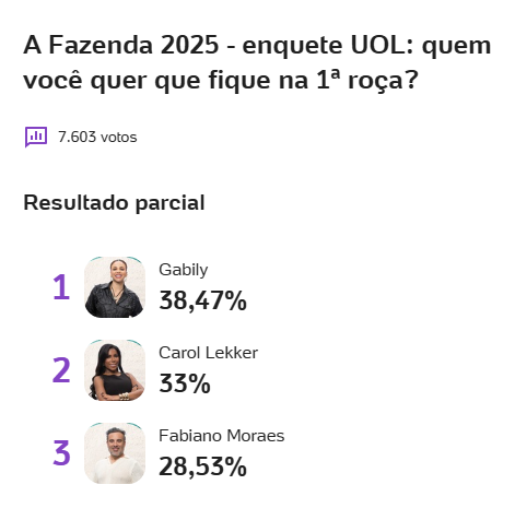 As parciais mostram cenários bem distintos entre UOL e Votalhada, indicando uma votação dividida e um resultado ainda imprevisível. Enquanto Gabily aparece líder na UOL, Carol Lekker dispara na Votalhada. Fabiano, pai de Viih Tube, está em situação delicada nas duas votações e pode ser o primeiro eliminado, caso a tendência se mantenha até o resultado oficial.