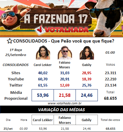 Enquete A Fazenda 17 Votalhada (Atualizada às 01:00 de 25/09)
