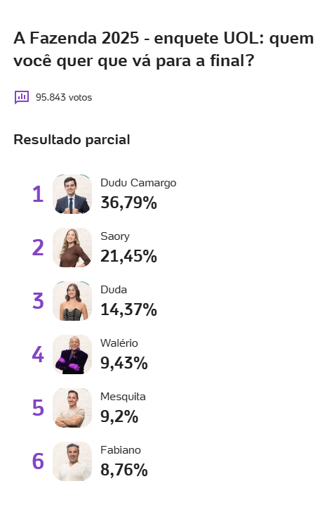 Parcial Enquete UOL Última Roça A Fazenda 17 (Atualizado 16/12 às 12:17)