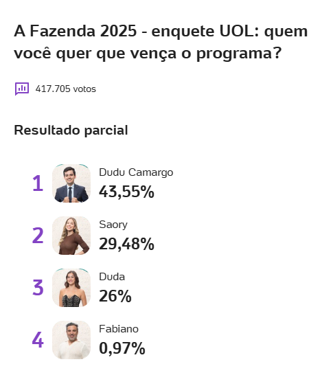 Parcial Enquete UOL Quem vai vencer A Fazenda 17 (Atualizado 18/12 às 20:00)