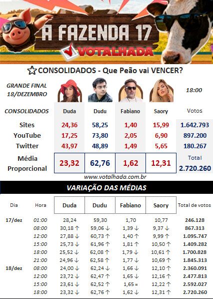 Parcial Votalhada Quem vai vencer A Fazenda 17 (Atualizado 18/12 às 18:00)