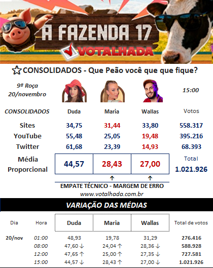 Parcial Votalhada A Fazenda 17 9ª Roça (Atualizado 20/11 às 15h)