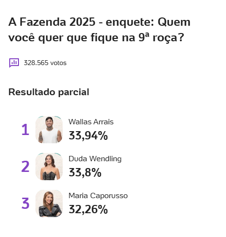 Veja as parciais das enquetes UOL e Votalhada da 9ª Roça de A Fazenda 17 e descubra quem lidera a votação e quem corre risco de eliminação hoje.