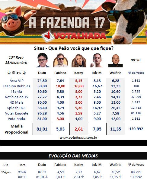 Parcial Enquete UOL Roça Especial A Fazenda 17 (Atualizado 15/12 às 02:03)