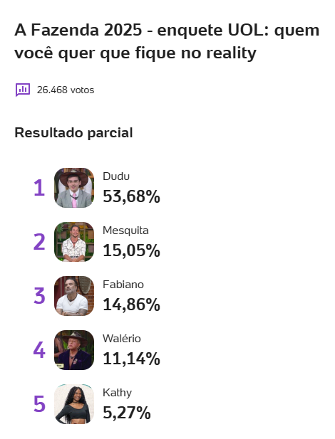A atualização das 02h03 da Enquete UOL traz um cenário de domínio total de Dudu Camargo. O peão aparece com mais da metade dos votos totais, consolidando-se como o grande favorito desta roça. Logo atrás, há um bloco intermediário disputado por Mesquita, Fabiano e Walério. No entanto, a situação é dramática para Kathy Maravilha, que aparece isolada na última posição com apenas 5% da preferência, correndo risco iminente de eliminação.
