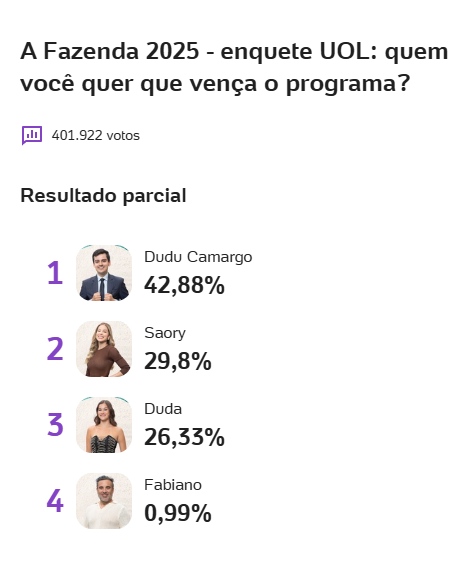 Parcial Enquete UOL Quem vai vencer A Fazenda 17 (Atualizado 18/12 às 17:18)
