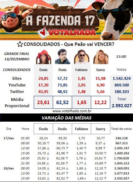 Parcial Votalhada Quem vai vencer A Fazenda 17 (Atualizado 18/12 às 15:00)