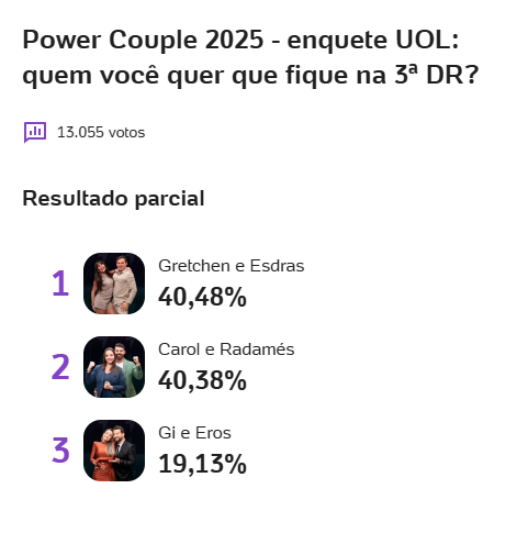 A Enquete Power Couple UOL e Votalhada segue atualizando o cenário da votação da segunda D.R. do Power Couple Brasil 7 — e a disputa está mais acirrada do que nunca! Gretchen & Esdras, Carol & Radamés e Gi & Eros seguem batalhando pelo apoio dos fãs, com as torcidas movimentando intensamente as pesquisas. As parciais mais recentes mostram um verdadeiro empate técnico entre os favoritos, tornando esta D.R. uma das mais imprevisíveis da temporada!