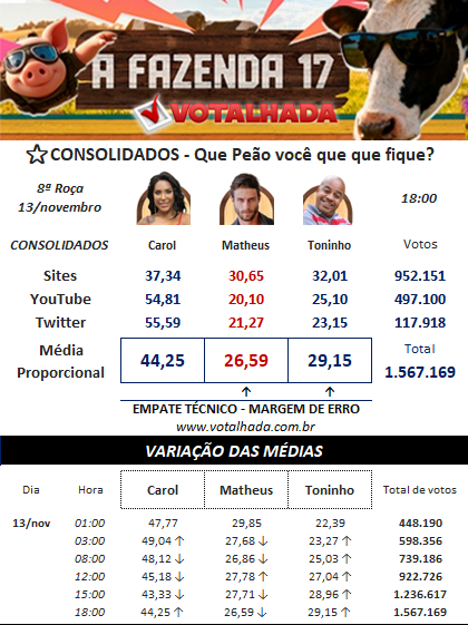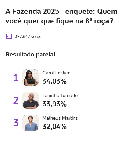 A disputa está extremamente equilibrada na enquete UOL, com Carol e Toninho praticamente empatados e Matheus logo atrás. Já na Votalhada, Carol lidera com folga, mas Matheus e Toninho ainda têm chances de virar o jogo. Se você quer influenciar o resultado, não deixe de participar da r7 votação oficial e votar na Fazenda 17 para salvar seu peão favorito!