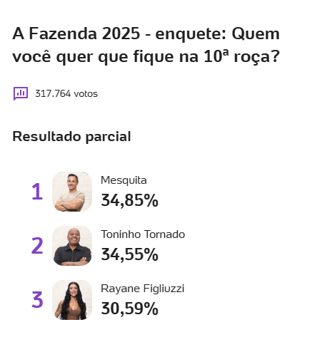 A atualização mais recente da Enquete UOL aponta uma disputa voto a voto pela liderança, mas traz uma má notícia para Rayane. A peoa aparece na lanterna da votação, com cerca de 30% da preferência, o que indicaria sua eliminação. No entanto, a diferença para os outros competidores é pequena, e qualquer mobilização pode alterar o resultado. Mesquita e Toninho aparecem tecnicamente empatados na ponta, lutando pela preferência do público do portal.