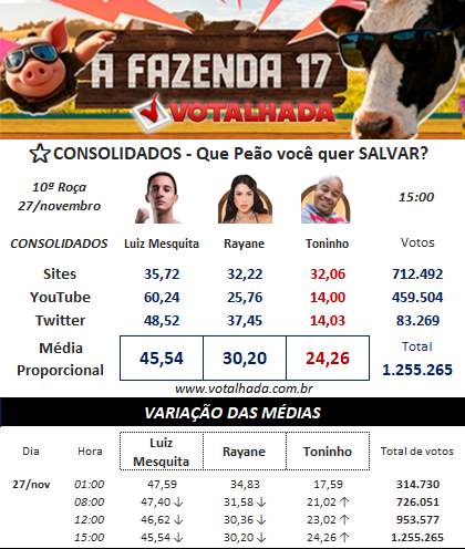 Parcial Votalhada 10ª Roça A Fazenda 17 (Atualizado 27/11 às 15:00)