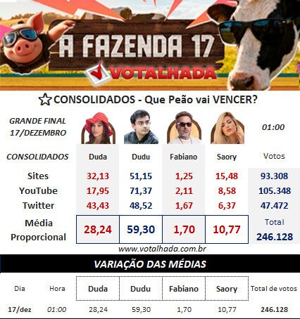 Parcial Votalhada Quem vai vencer A Fazenda 17 (Atualizado 17/12 às 01:00)