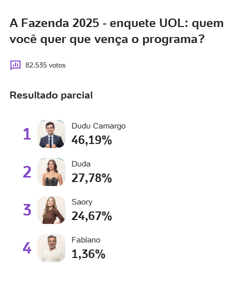 Parcial Enquete UOL Quem vai vencer A Fazenda 17 (Atualizado 17/12 às 05:30)