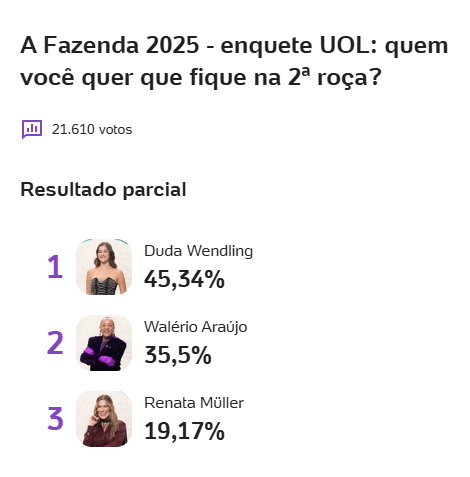 Chegou o momento decisivo para Duda Wendling, Walério Araújo e Renata Muller na 2ª Roça de A Fazenda 17! As votações estão encerrando e o clima de expectativa toma conta das torcidas, que fizeram de tudo para garantir a permanência dos seus favoritos no reality. As parciais finais das enquetes UOL e Votalhada já sinalizam um possível resultado e agitam ainda mais as redes sociais.