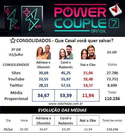 É hora da Enquete UOL e Votalhada Power Couple! Uma nova semana traz consigo uma nova D.R. no Power Couple Brasil, e a tensão já toma conta da casa! Após um ciclo repleto de desafios de tirar o fôlego, os casais agora enfrentam a décima D.R., que vai decidir quem avança no jogo e quem ficará apenas na vontade. Os protagonistas dessa vez são Nat e Eike, Carol e Radamés, e Adriana e Dhomini.