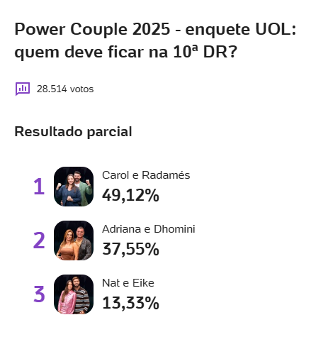 Parcial Enquete Power Couple UOL (Atualizado em 03/07/2025 às 02h25)