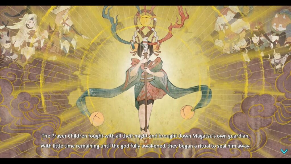 A premissa em si é interessante: o deus maligno Magatsu ameaça o mundo, e cabe à sacerdotisa Towa e aos guardiões ligados à Árvore Sagrada proteger Shinju Village e impedir que tudo vá pro buraco. Há elementos de linhas do tempo fragmentadas, Towa pulando entre realidades, tentativas de consertar o que foi quebrado e a presença dos Prayer Children como peças-chave nessa guerra espiritual.