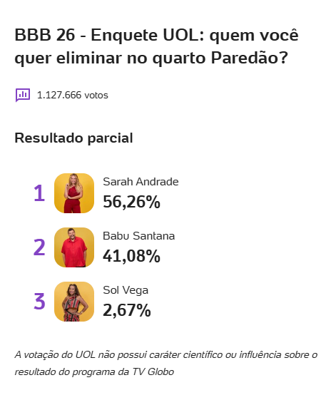 Enquete BBB 26 UOL (Atualizada as 21:22 de 10/02):