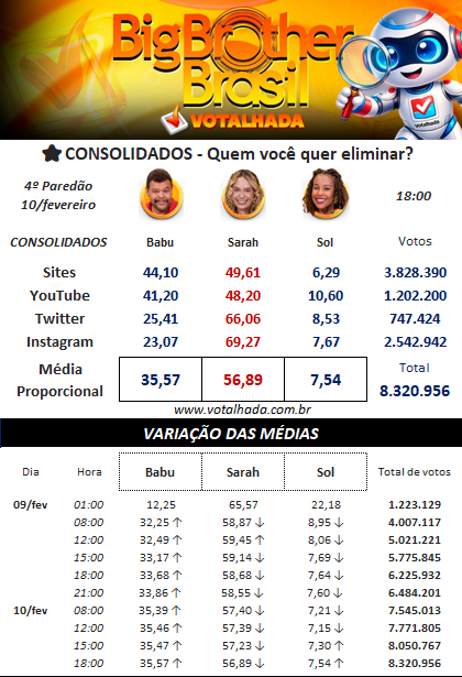 Pesquisa Votalhada BBB 26 (Atualizada às 18:00 de 10/02):