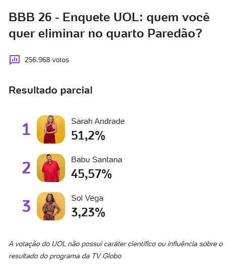 Quem sai do BBB 26? Enquete UOL mostra disputa acirrada entre Sarah e Babu com nova regra de Voto Único. Veja a parcial do 4º Paredão (09/02).