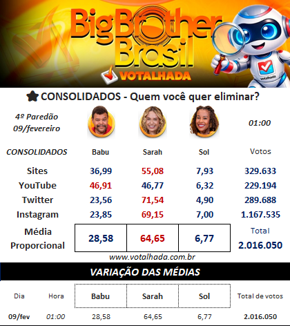 Já na pesquisa do Votalhada, que compila dados de diversas enquetes, a situação de Sarah parece muito mais delicada. A atualização da 01h mostra a sister com uma vantagem larga sobre os adversários.