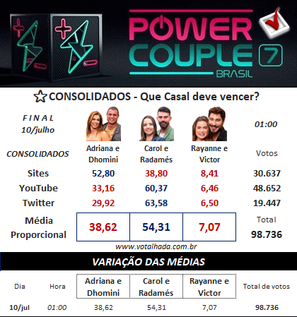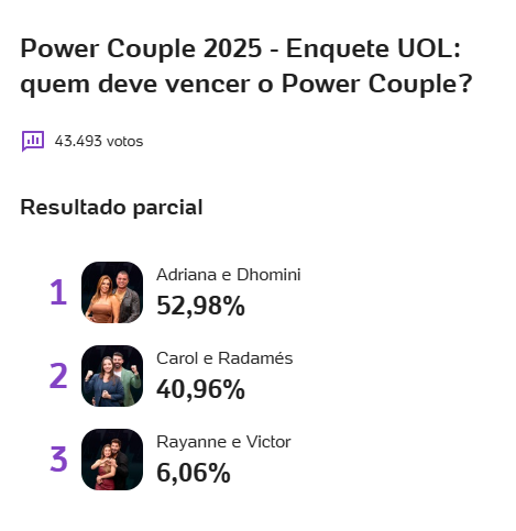 Parcial Enquete UOL e Votalhada Final do Power Couple Brasil mantém o suspense e a animação na tão aguardada decisão do reality! Com a grande final marcada para esta quinta-feira (10) às 22h30, o país inteiro acompanha, voto a voto, quem será o casal a conquistar o prêmio máximo desta temporada histórica. Adriana e Dhomini, Carol e Radamés, e Rayanne e Victor são os protagonistas desta etapa derradeira e contam com a força das torcidas para virar o jogo.